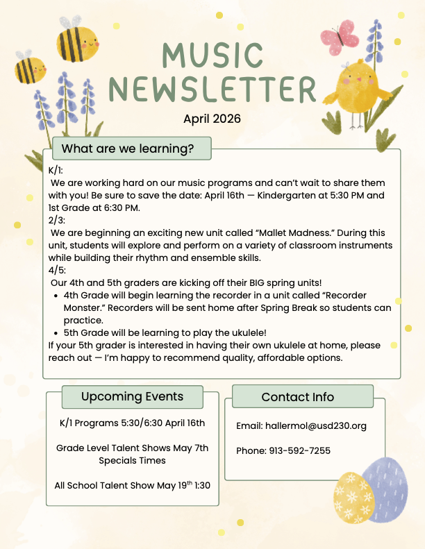Apr. 16th - Kinder Music Concert 5:30pm, 1st Grade Music Concert 6:30pm