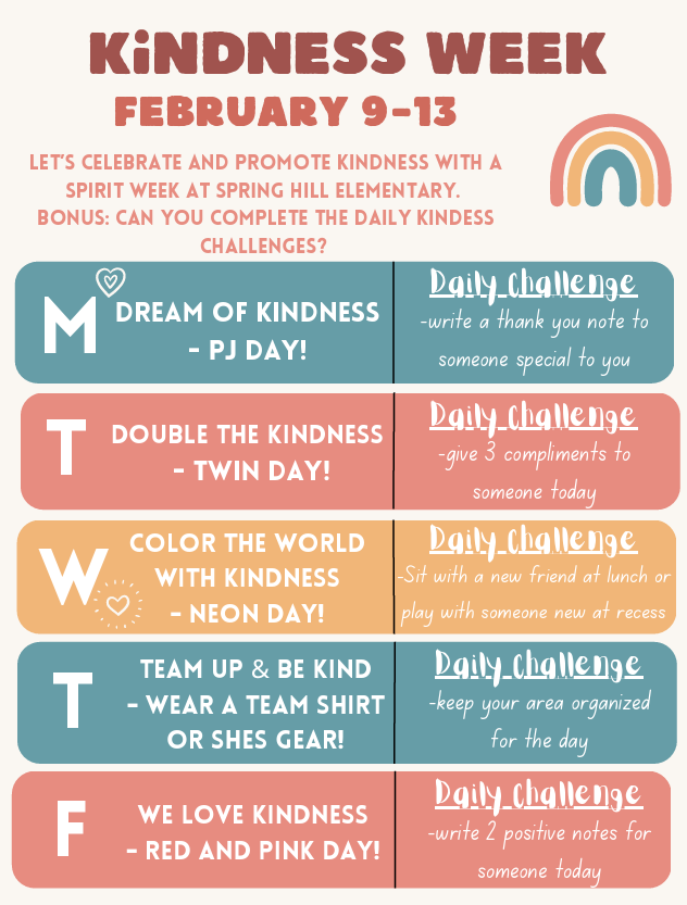 Important Dates: Monday, February 9th - Friday, February 13th - STUCO Kindness Spirit Week