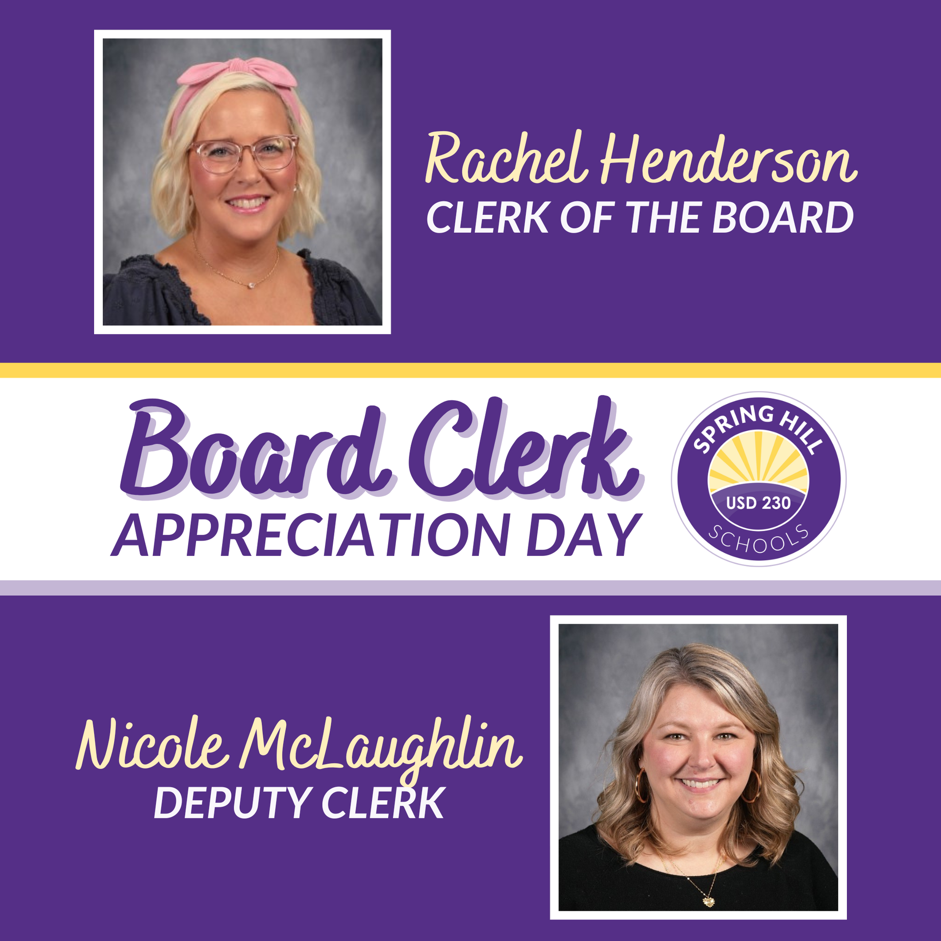 Also, January 28 was Board Clerk Appreciation Day and we are fortunate to have two of the best. We thank Rachel Henderson, Clerk of the Board, and Nicole McLaughlin, Deputy Clerk, for their exceptional service and dedication to Spring Hill Schools! |