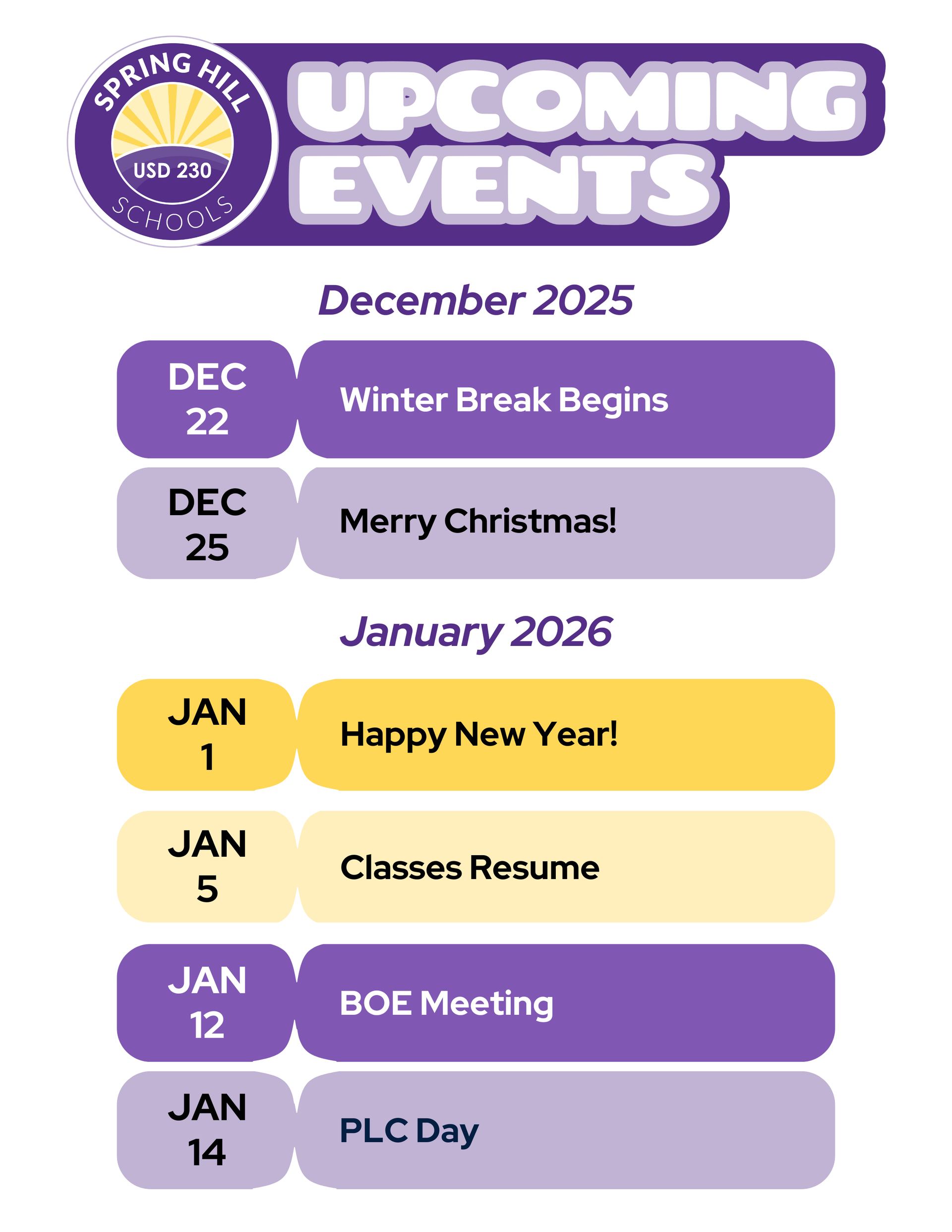Merry Christmas, and best wishes for an even better New Year in 2026. Please know how much I truly enjoy and appreciate the opportunity to serve as Superintendent of Spring Hill Schools.