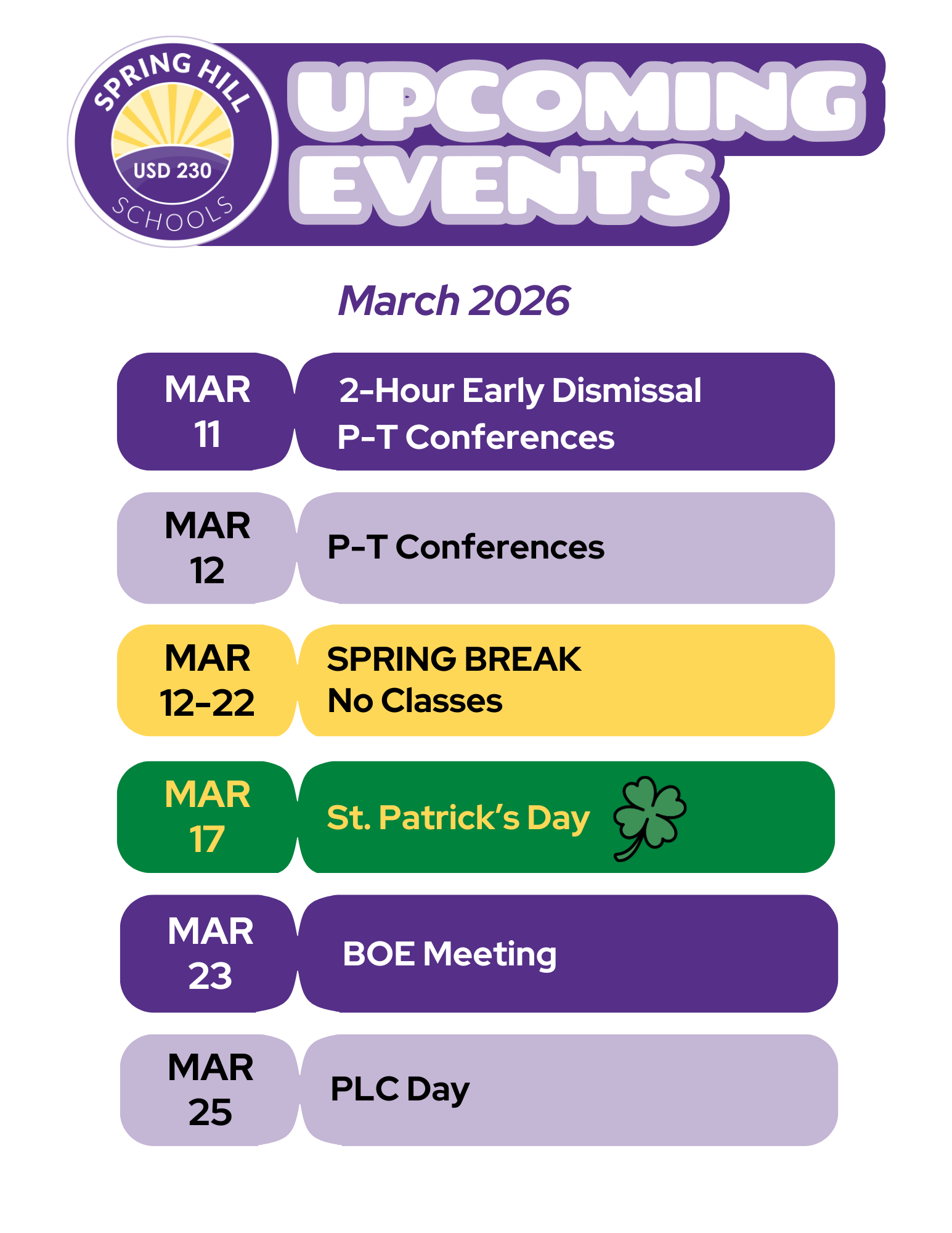 March is well underway, and Spring Break has arrived. When students and staff return, there will be 43 attendance days remaining in the 2025–26 school year. Graduation for the Class of 2026 remains scheduled for Saturday, May 16, 2026, at 10:00 a.m.